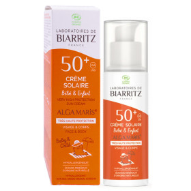 La Crème Solaire SPF50+ Bébé Enfant ALGA MARIS à prix pas cher de LABORATOIRES DE BIARRITZ, la cosmétique naturelle et Bio Made in France, dans votre parapharmacie en ligne, dans un soin très haute protection solaire minéral sans filtre chimique, pour les peaux sensibles et fragiles des bébés et des enfants (à partir de 6 mois). Visage et Corps