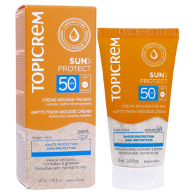 TOPICREM SUN PROTECT CREME MOUSSE FINI MAT SPF 50+ visage est en vente en ligne sur le site de votre parapharmacie à prix pas cher, une crème visage au fini mat conçue pour les peaux mixtes à grasses et les usages quotidiens.