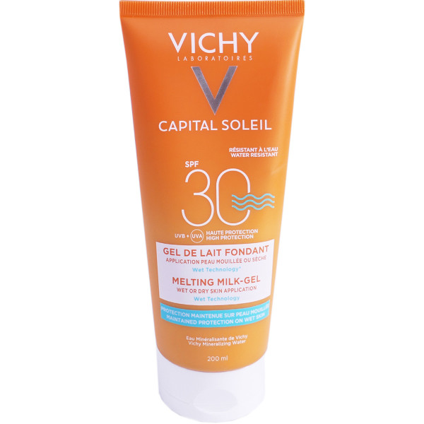 Le Gel de lait fondant SPF30 CAPITAL SOLEIL de Vichy, à la texture au fini invisible qui permet une application facile sans laisser de trace blanche, formulé à base d’eau thermale de Vichy aux propriétés apaisantes et fortifiantes, est le gel haute protection spécialement adapté aux femmes et aux hommes. Les laboratoires Vichy ont intégré dans sa composition un système filtrant large spectre UVA-UVB et photostable à base de Mexoryl® XL et SX qui assure une protection efficace contre les effets néfastes des UV. Innovant ce gel ultra-fondant bénéficie de la Wet Technology qui va permettre de protéger la peau même mouillée en repoussant l’eau sur la peau afin qu’elle ne se dilue pas dans l’eau ou lors de transpiration. Hypoallergéniques, Sans paraben, testé sur peaux sensibles sous contrôle dermatologique.